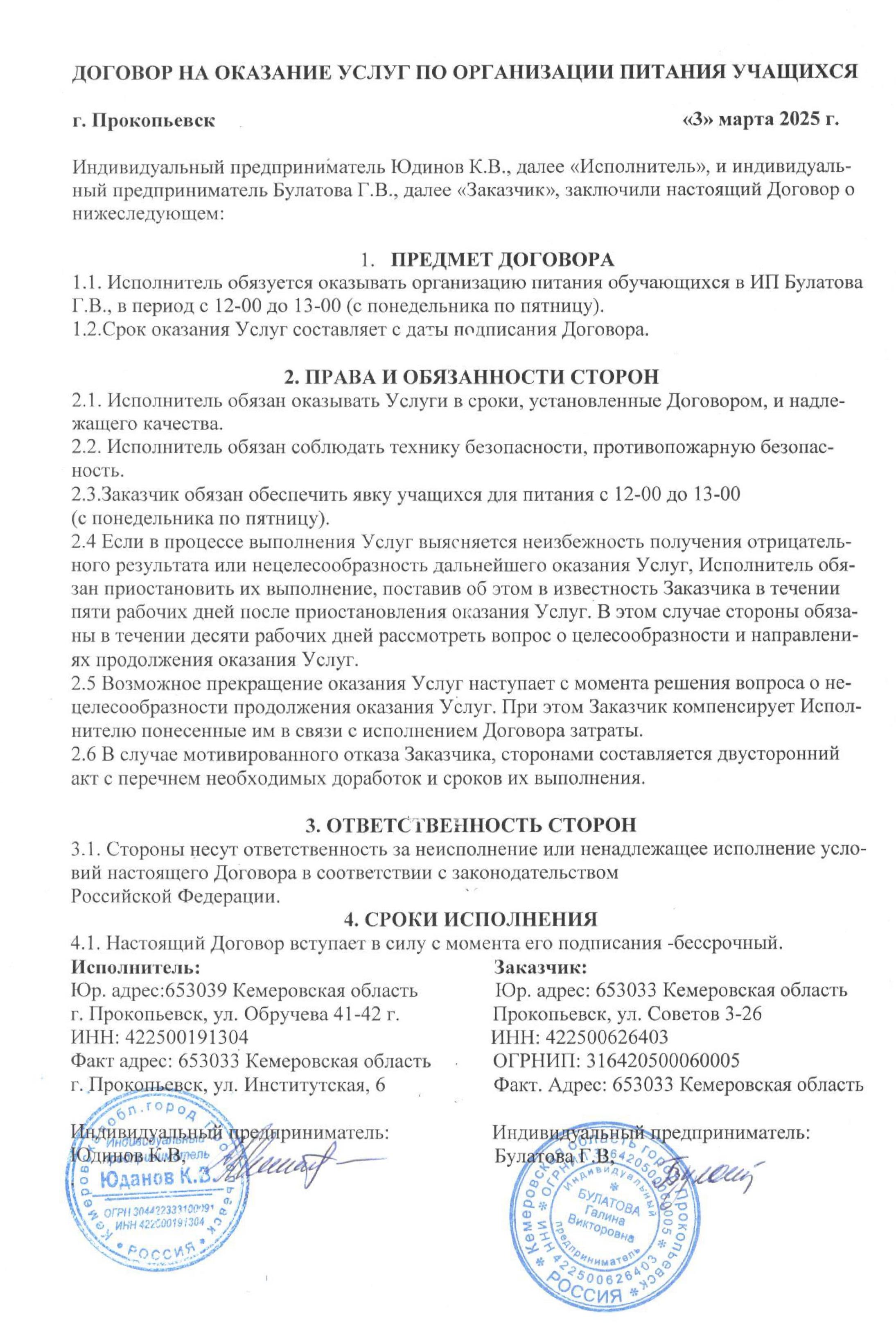 1. Организация питания обучающихся осуществляется на основании Договора на оказание услуг по организации питания учащихся с ИП Юданов К.В.